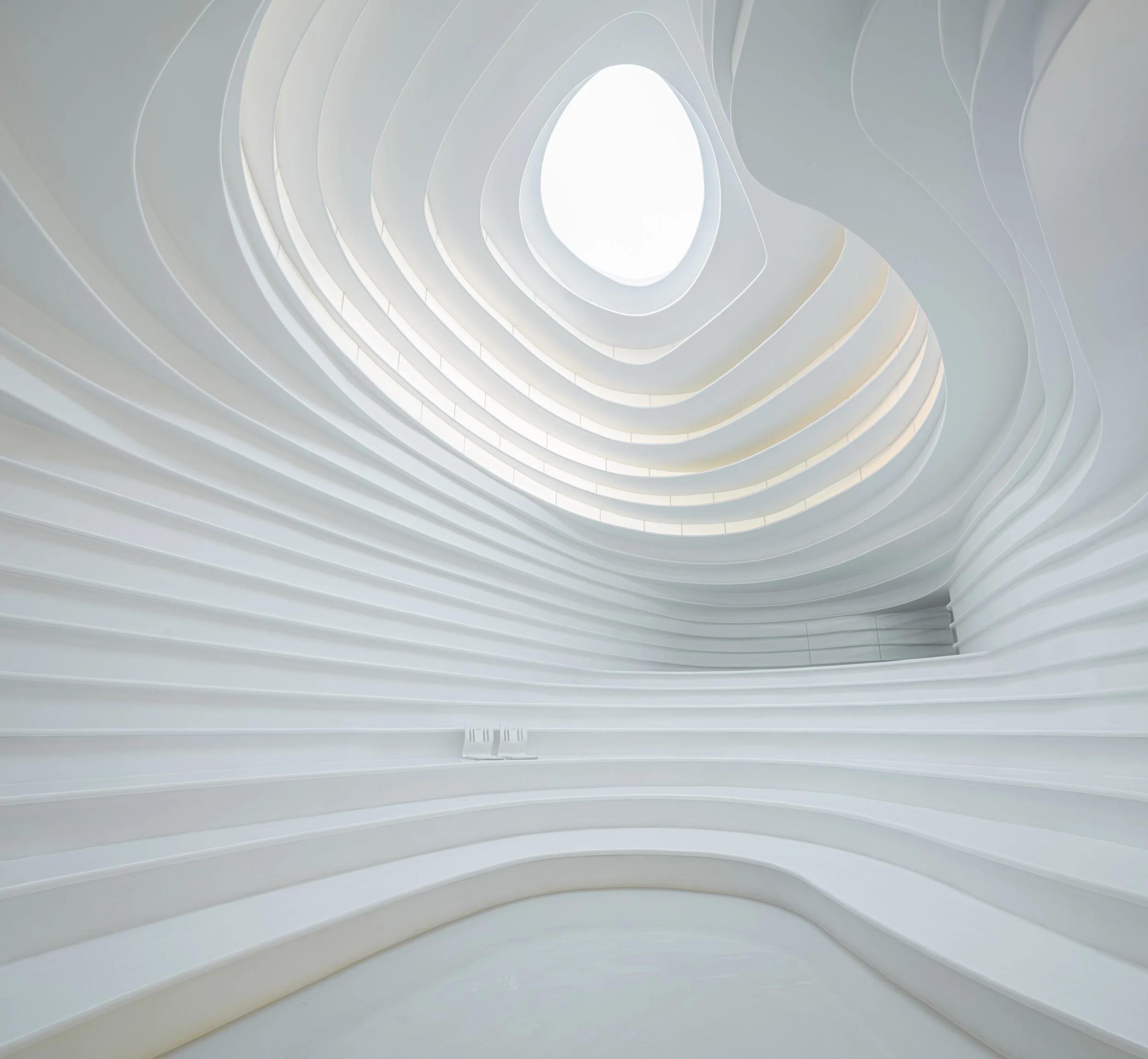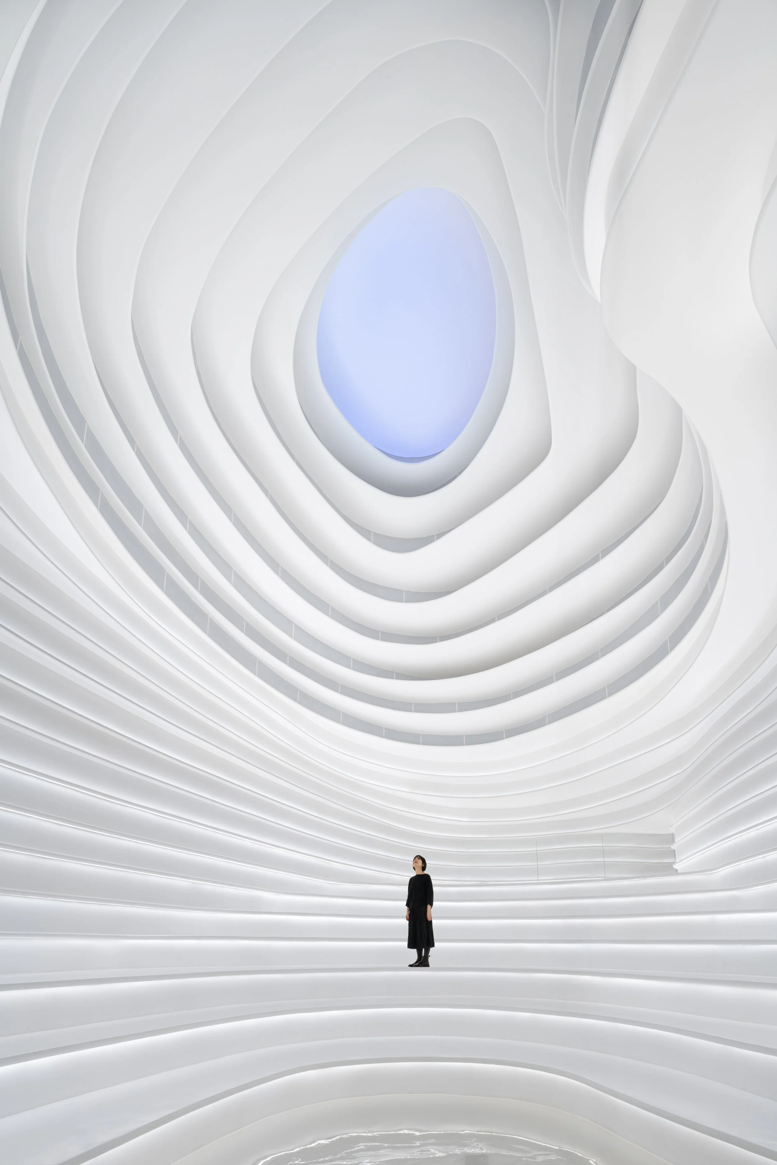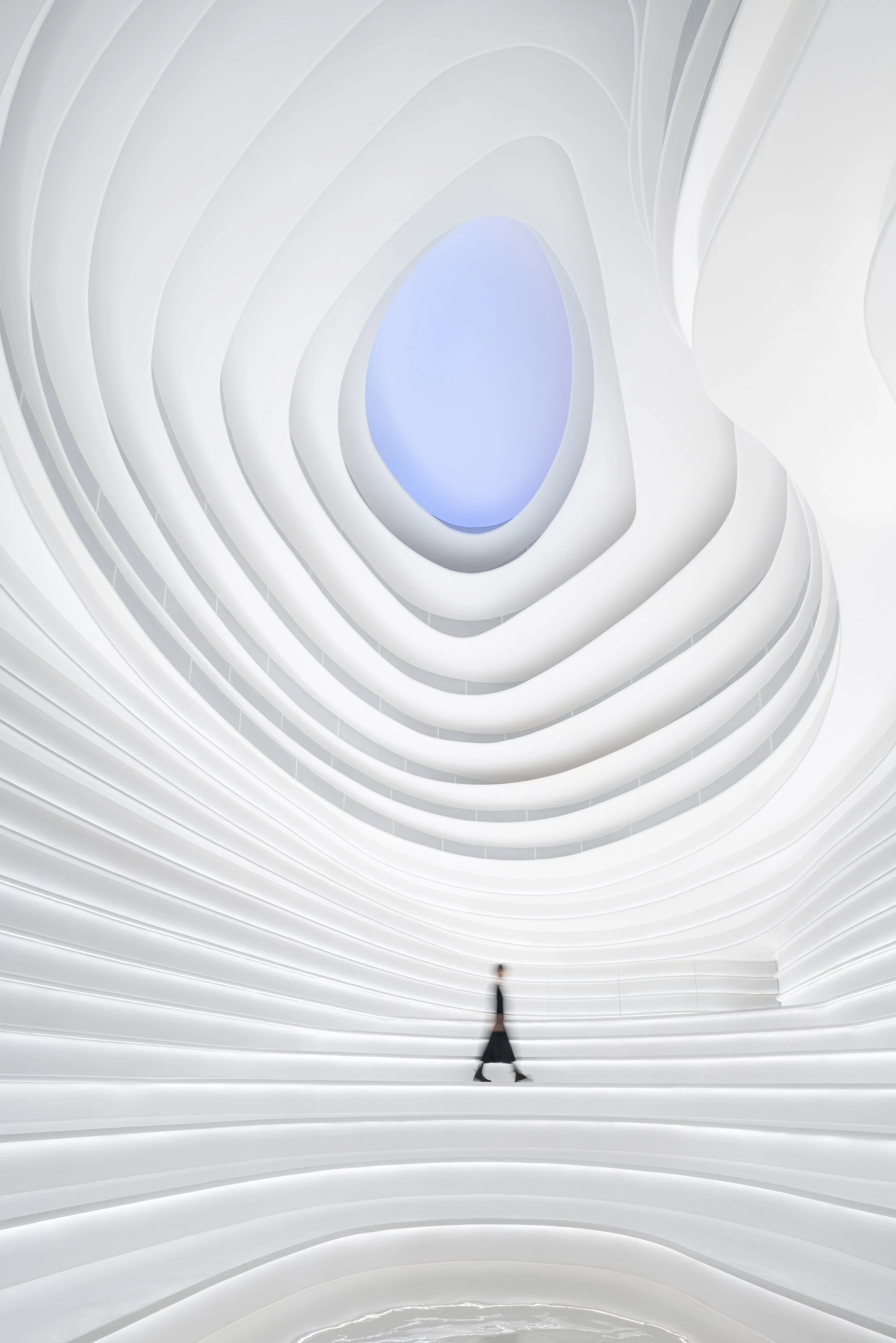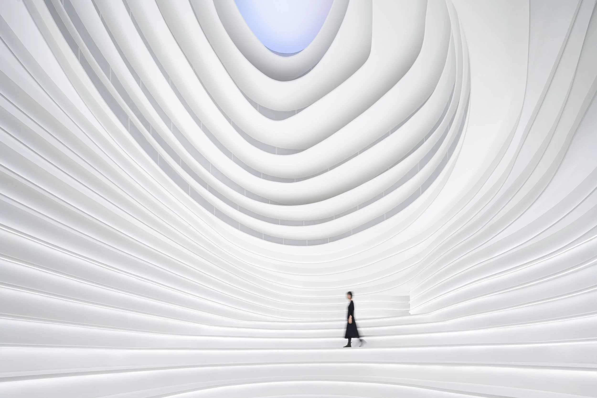 In 2022: Golong Wormhole, there are three interdependent and interconnected gallery spaces. The wormhole, an immersive space tying all galleries together, is the focal point of the exhibition. As the only part of the exhibition space that is not rectilinear, the sinuous elements extend and undulate from the foot of the shell-like installation to the very top, blurring the traditional definitions of what constitutes a room. The space is imbued with motion and speed, possibly submerging some unseemly visitors in an uneasy sensation that challenges the known and unknown about wormholes in our galaxy. The wormhole is interpreted as a sculpture that encompasses the viewer, enhancing their awareness and provoking their senses about light, form, and scale. It invites the viewer to be suspended in a reality in which the viewer takes on the role of an intrusive explorer, actively trying to measure and to interpret. During events, the wormhole comfortably seats around 60 people on the steps. On days without events, the wormhole is a space that employees would come to contemplate and unwind.