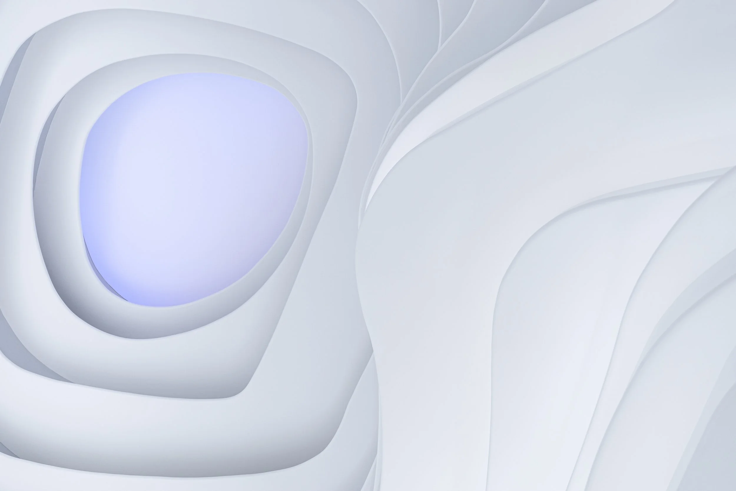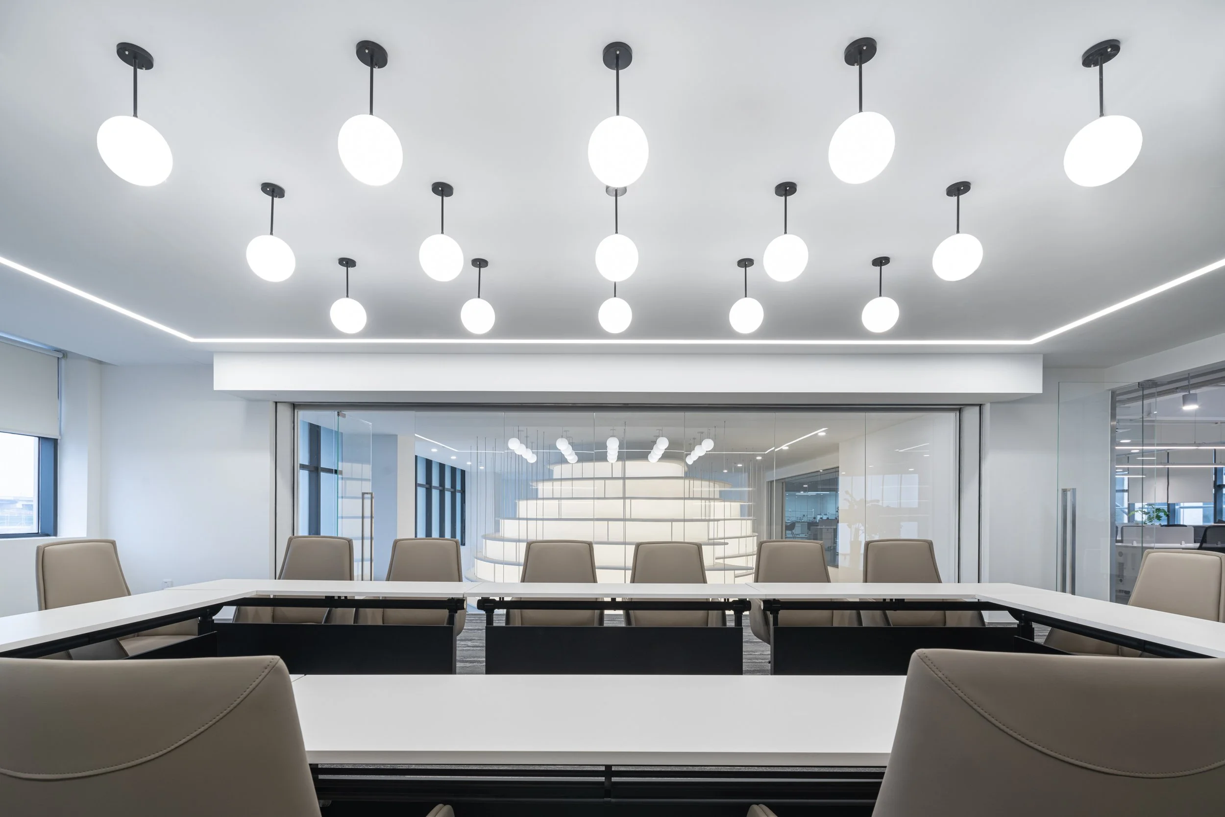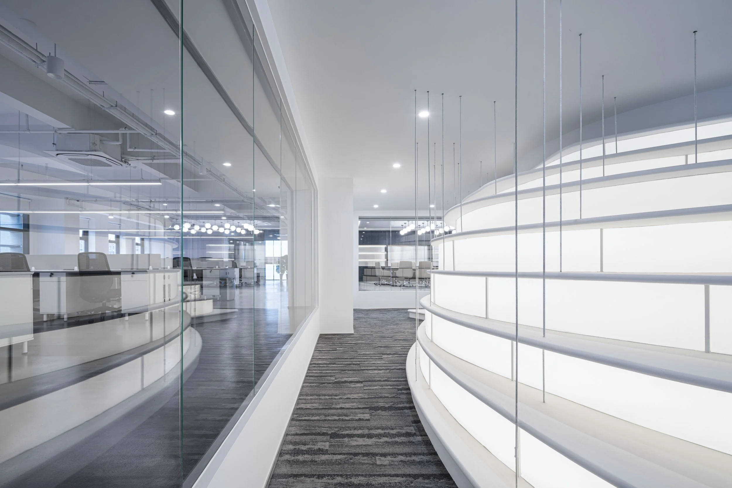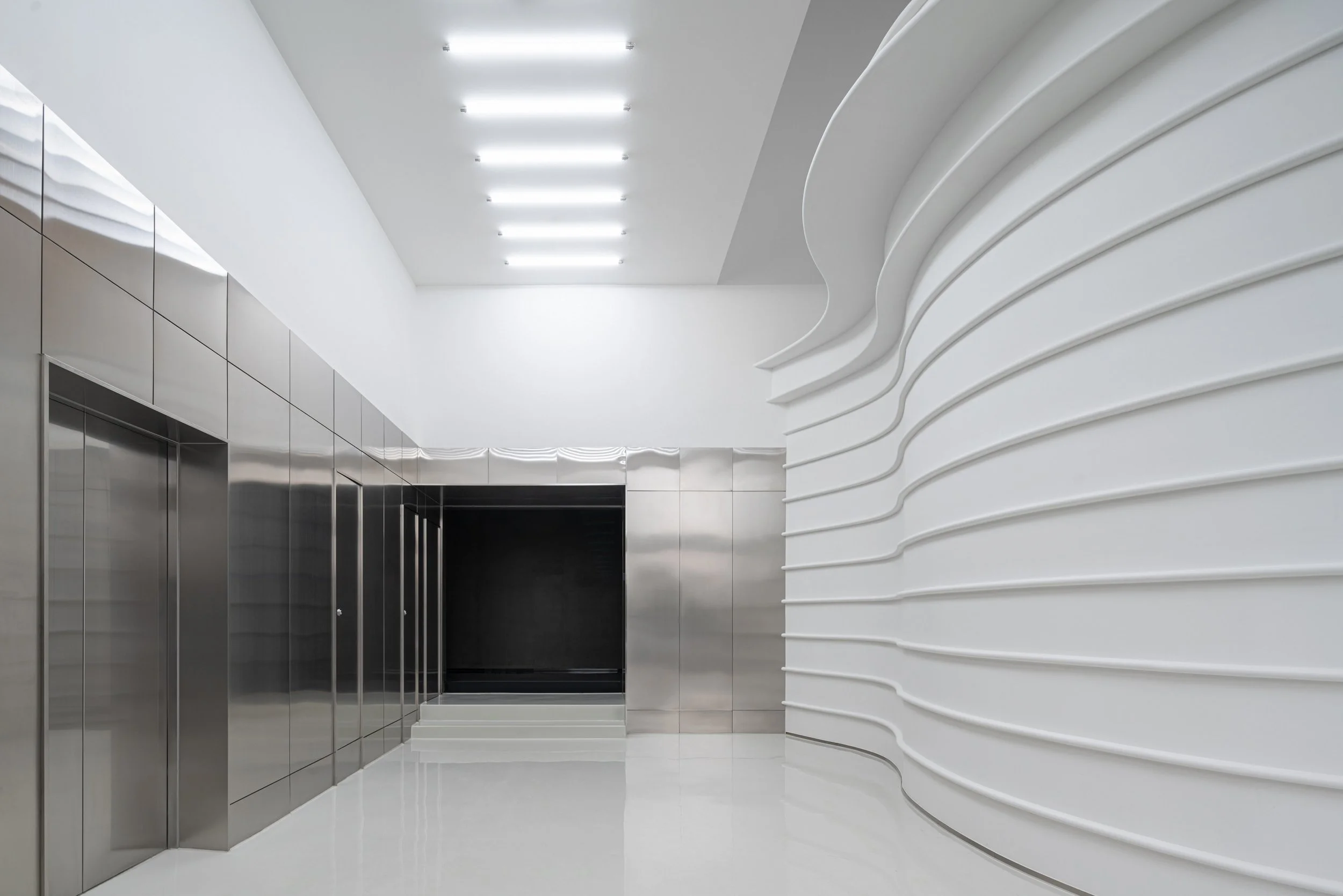 In 2022: Golong Wormhole, there are three interdependent and interconnected gallery spaces. The wormhole, an immersive space tying all galleries together, is the focal point of the exhibition. As the only part of the exhibition space that is not rectilinear, the sinuous elements extend and undulate from the foot of the shell-like installation to the very top, blurring the traditional definitions of what constitutes a room. The space is imbued with motion and speed, possibly submerging some unseemly visitors in an uneasy sensation that challenges the known and unknown about wormholes in our galaxy. The wormhole is interpreted as a sculpture that encompasses the viewer, enhancing their awareness and provoking their senses about light, form, and scale. It invites the viewer to be suspended in a reality in which the viewer takes on the role of an intrusive explorer, actively trying to measure and to interpret. During events, the wormhole comfortably seats around 60 people on the steps. On days without events, the wormhole is a space that employees would come to contemplate and unwind.
