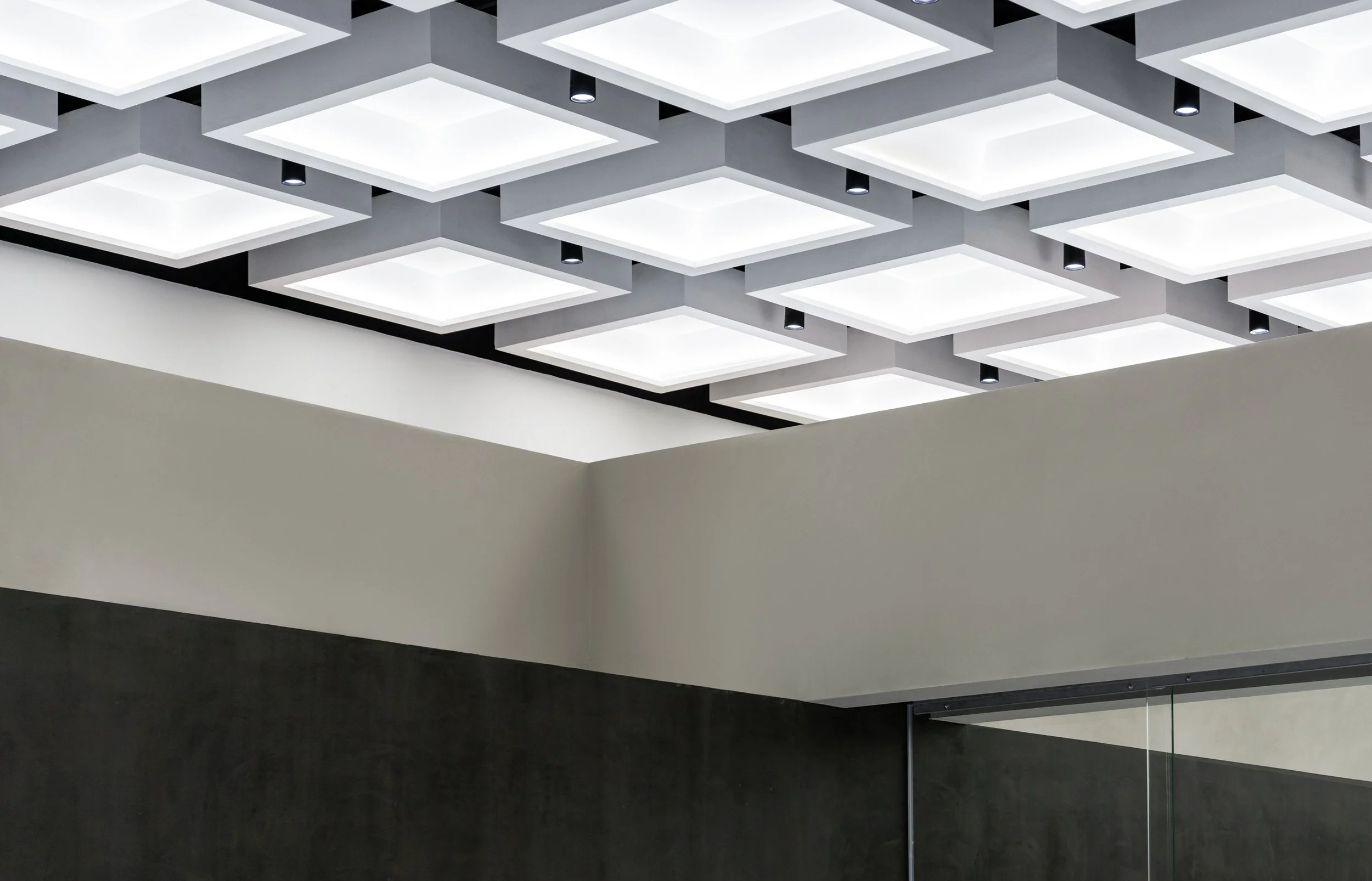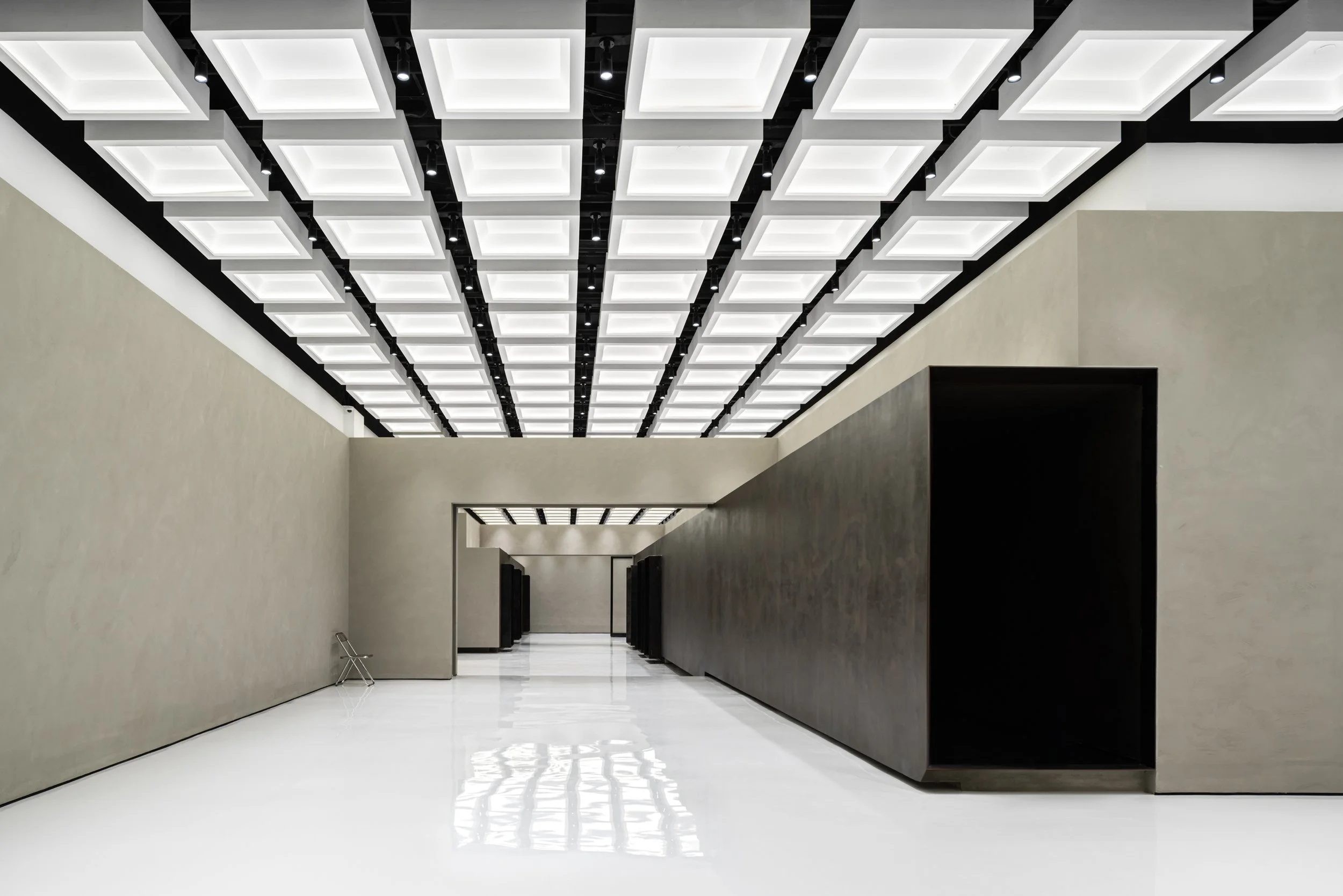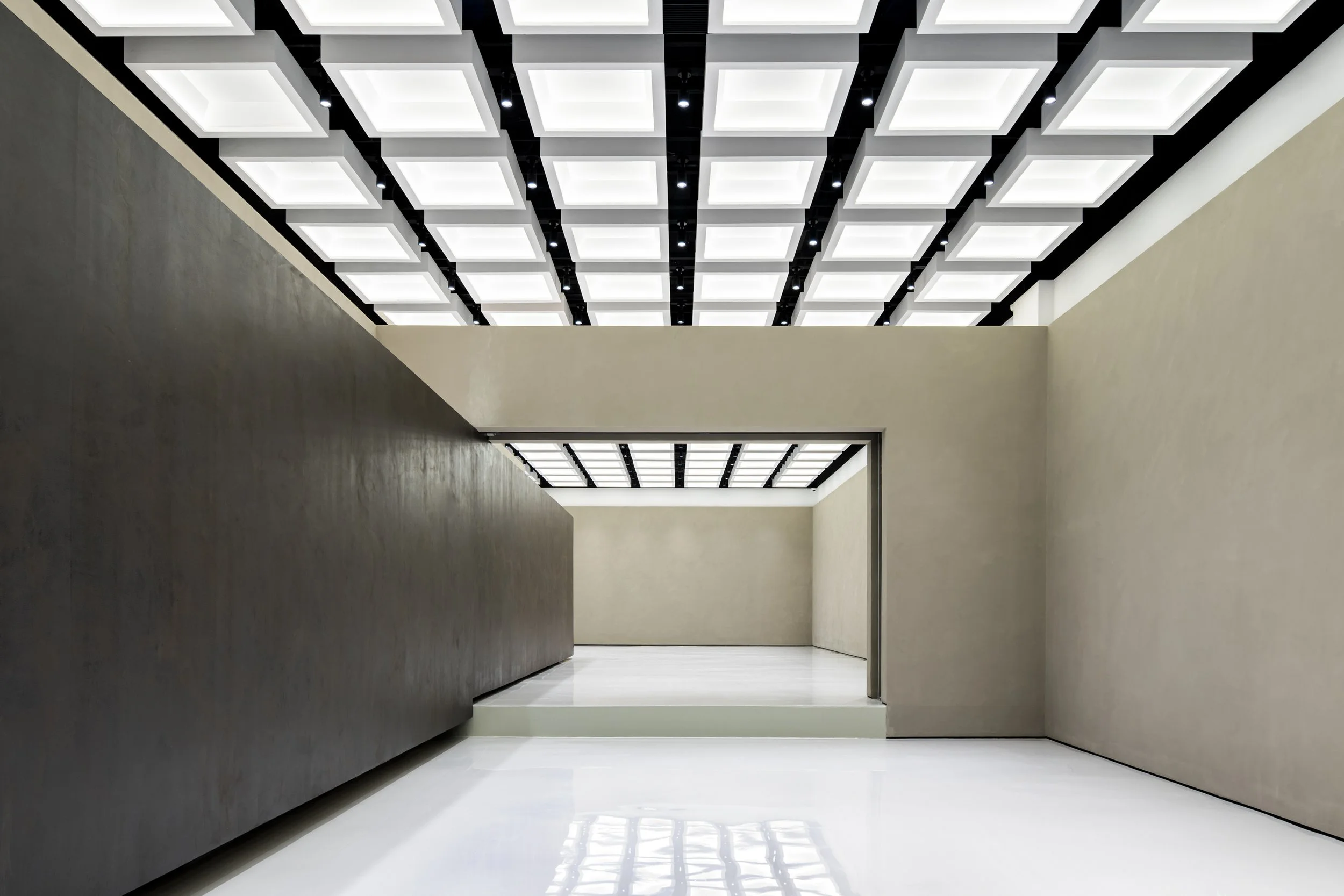 On both ends of the central wormhole, there are gallery spaces for agile programming needs. Unlike the wormhole, the galleries act as an anchor to the familiar, layering the latent and the seemingly banal. The grid present in the coffered ceiling is symbolic of a shared consciousness. It is measured and standardized, the existence of the grid is a calculated act of topography. The walls of the galleries are plastered by hand, whereas the floors are made of polished epoxy. The rotating partition in the west gallery is used to configure spatial divisions, creating changing boundaries based on programming needs and occasion. The rotating partition is equipped with electrical sockets and a hidden water inlet to function as a bar or a coffee stand during events. The gallery spaces can be subdivided by automatic glass partitions that are hidden into a pocket wall. The pocket wall is built to be a half wall, so the coffered ceiling is allowed to extend beyond.