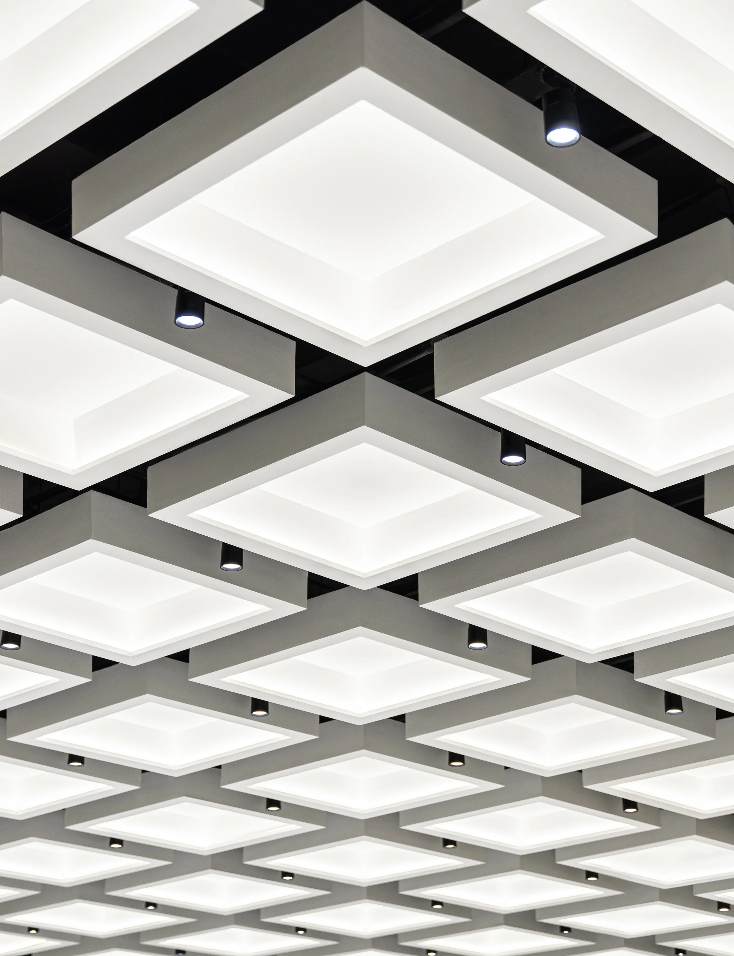 The wormhole is constructed of a structural frame made of galvanized steel studs that are welded on-site after a deliberate layout placement is done by projecting curves onto a grid. Fiber-cement backerboard is then used to line the frame, and precast GRC panels made specifically for each curvature are installed. From a secondary steel frame bolted into the floor slab above, steel cables hang rings of molded GRC panels on the upper portion of the wormhole shell. Frosted strips of bent acrylic is then slotted in between the suspended panels to create the translucent face panels.